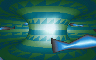 Wormhole: A downward rotating spiral that looks like a black hole. Done with clever organizing and palette rotation. (Screenshot from Unreal / Future Crew)